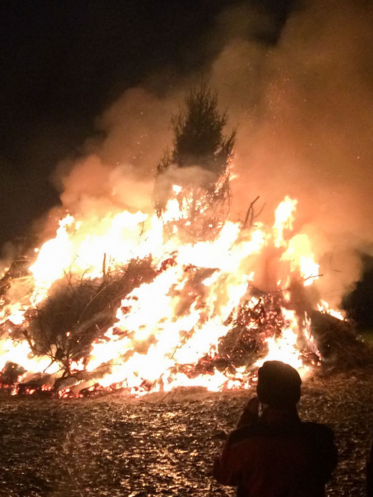 Nach getaner Arbeit und bei Anbruch der Dunkelheit wurde das aufgeschichtete Material für das Hüttenfeuer gemeinsam angezündet.