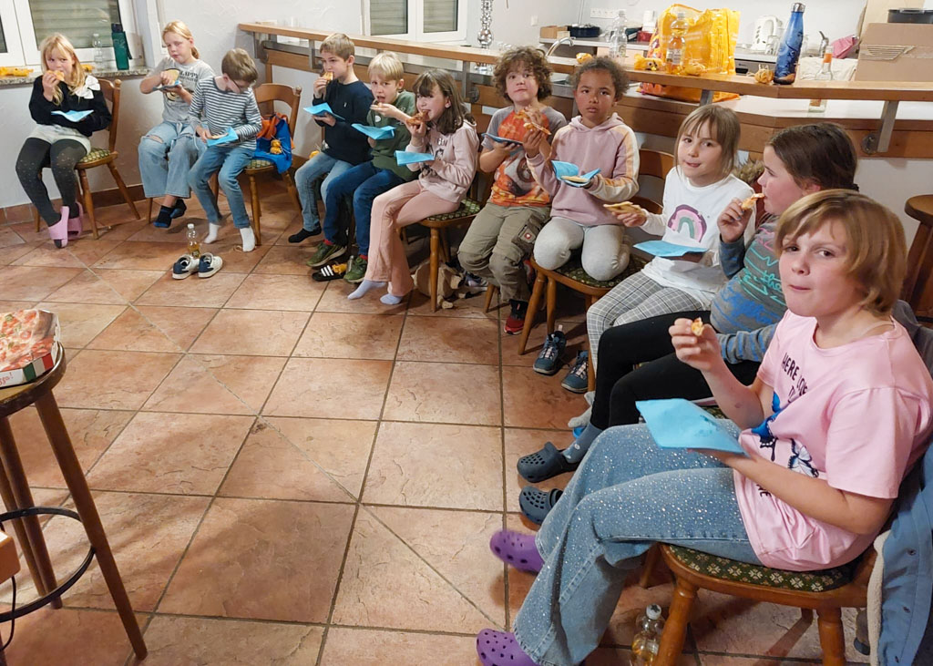 Pünktlich wie verabredet kam die große Pizzalieferung. Im Angebot war Margherita-, Funghi-, Salami- und Schinkenpizza. Dazu gab es Apfelschorle für alle. Es wurde viel gelacht über die lustigen Streiche von Michel. Satt und gut gelaunt beendeten wir den Kindertreff.