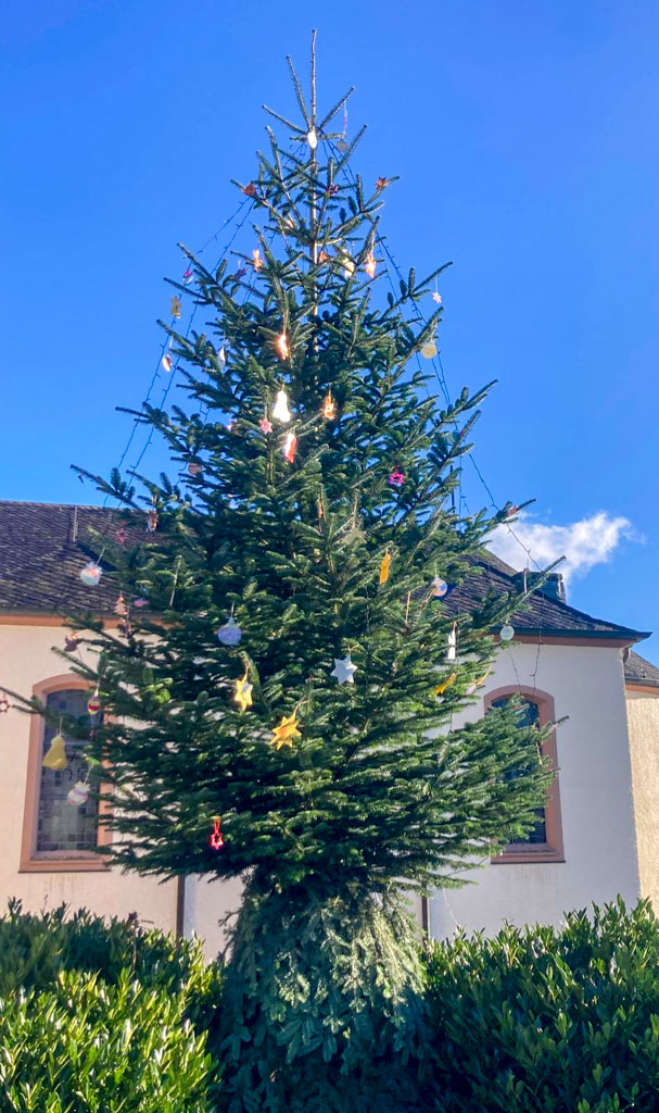 Der diesjährige Weihnachtsbaum auf dem Kirchplatz ist wieder mit wunderschönen, selbst gebastelten Kugeln, Sternen, Tannenbäumen und Nikolausstiefeln geschmückt. Fleißige Helfer des Kindergartens Rittersdorf haben uns dabei tatkräftig unterstützt. Unser Bild zeigt den festlich dekorierten Weihnachtsbaum sowie den von den Kita-Kindern liebevoll gestalteten Baumschmuck.