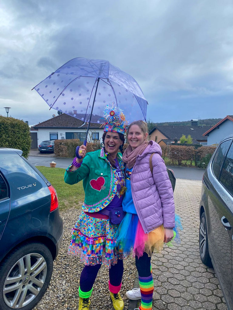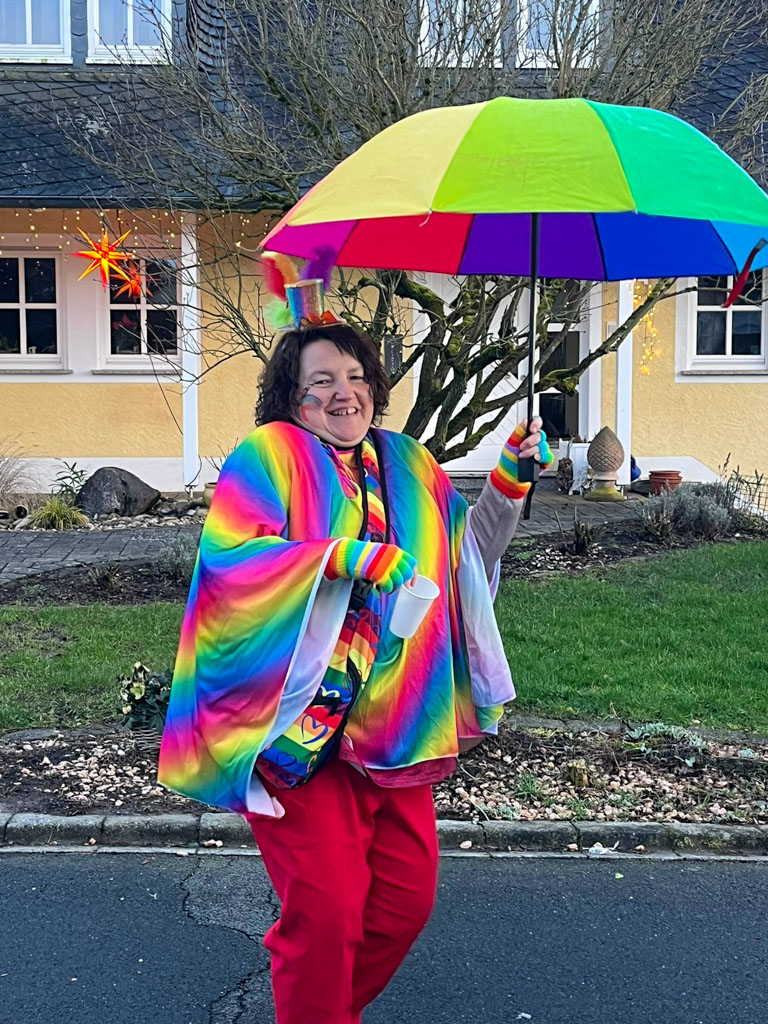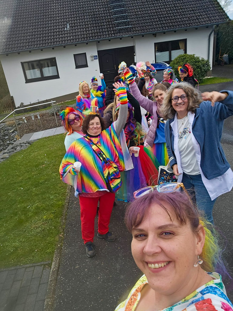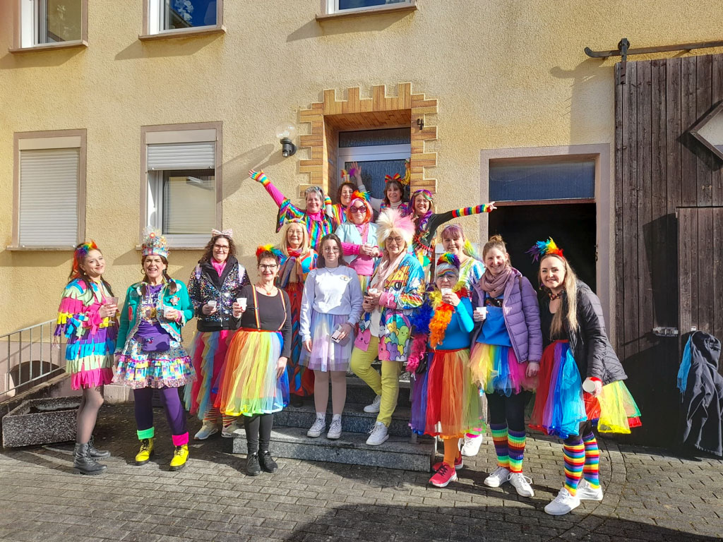 Am diesjährigen Weiberdonnerstag zogen die Rikschdorfer Möhnen los, um mit ihren bunten Kostümen Freude und Sonnenschein in die Häuser von Hasselt zu bringen. Bei dieser Mission herrschte ausgelassene Stimmung. Fröhlich singend und tanzend zog die als Regenbögen verkleidete Gruppe von Haus zu Haus und freute sich stets, andere mit ihrer guten Laune anstecken zu können.