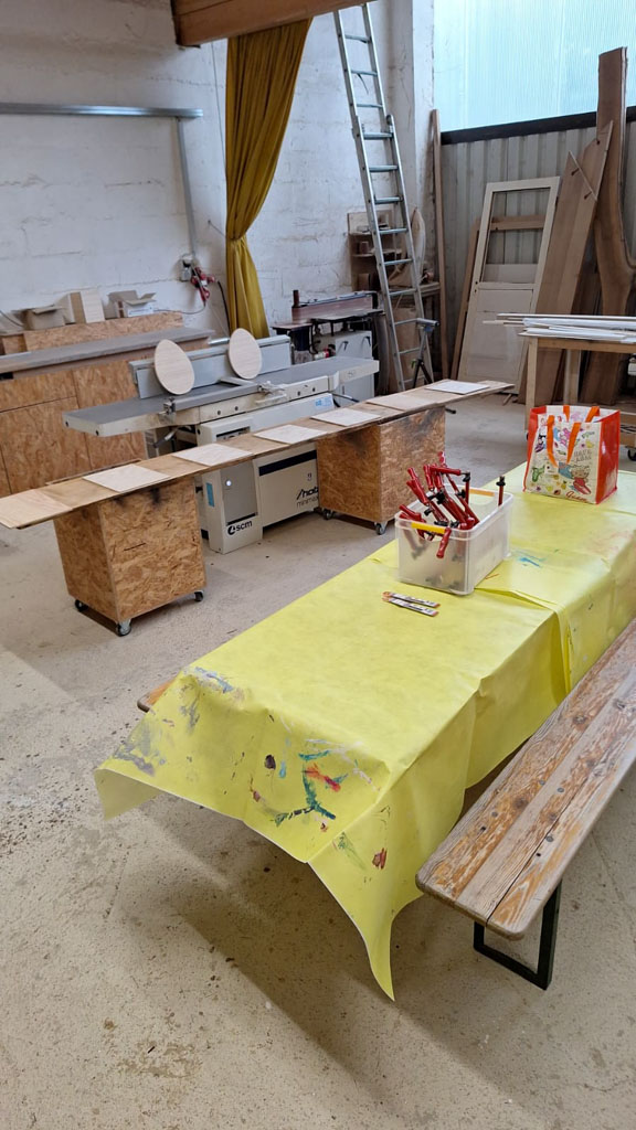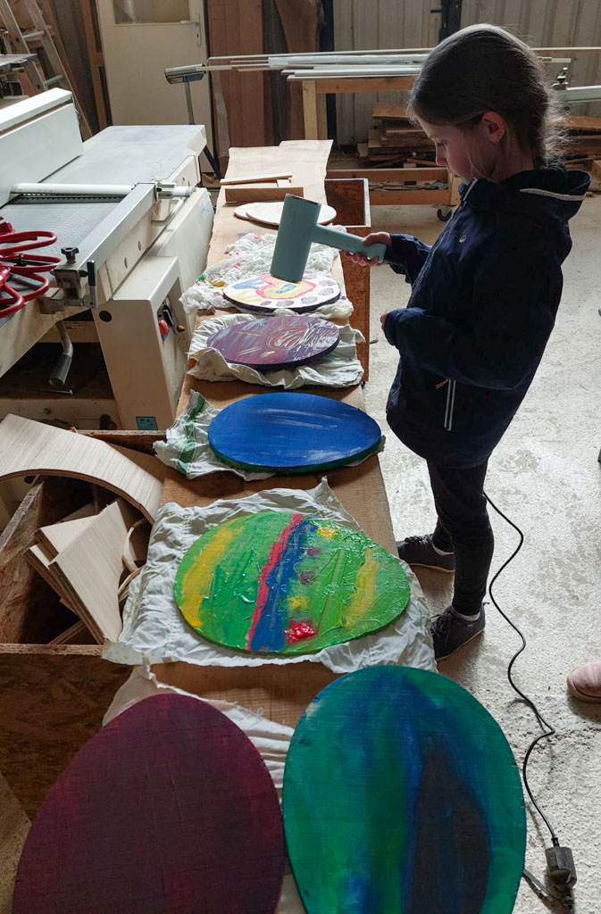 Tim Propson hatte jede Menge Holzreste vorbereitet. So wurde seine Werkstatt für einen Nachmittag zu unserer Ostereifabrik.