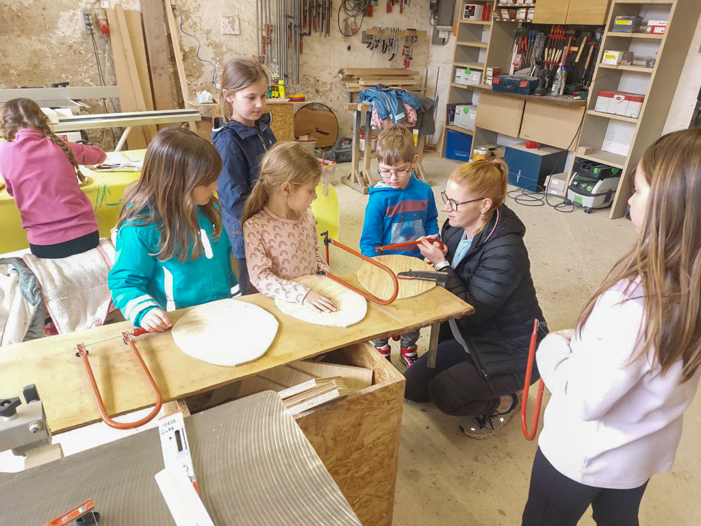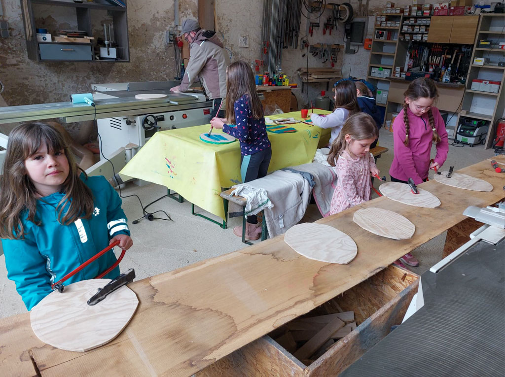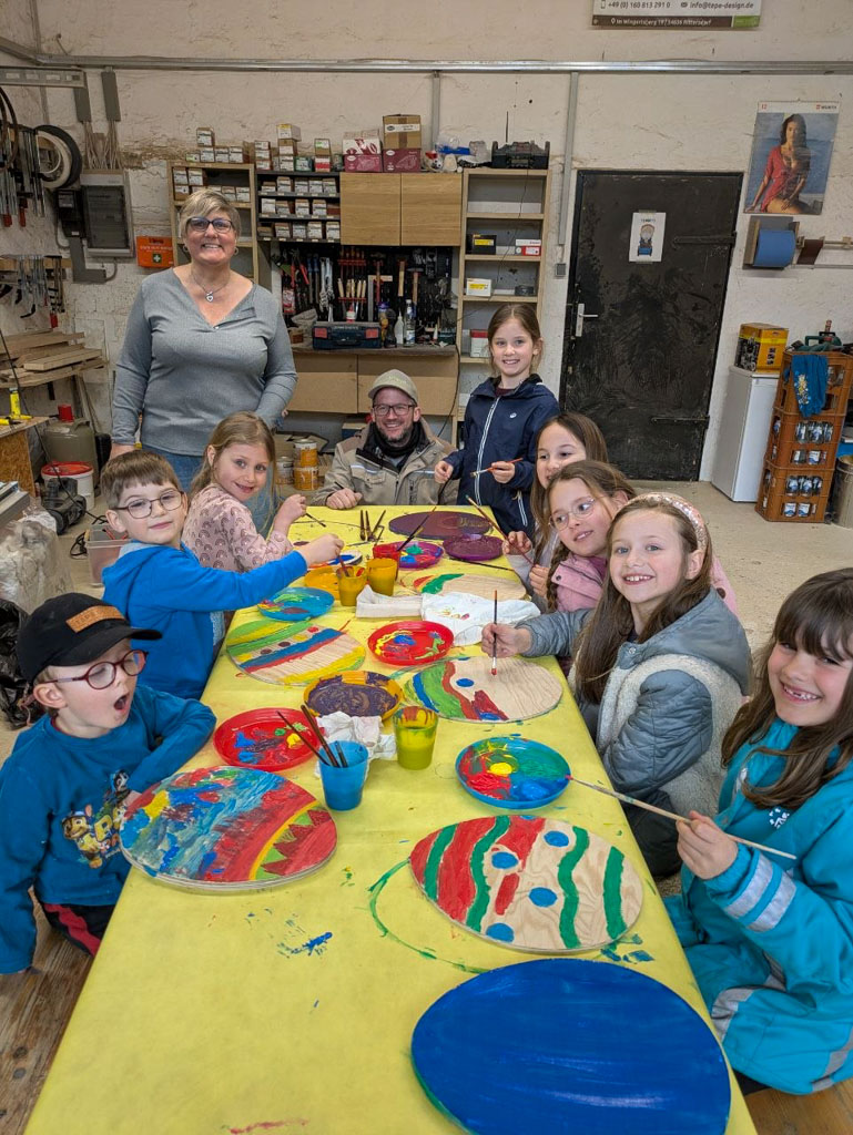 Einige vom Kindertreff durften spontan die Werkstatt von TePe Design besuchen, um dort gemeinsam Holzostereier herzustellen.