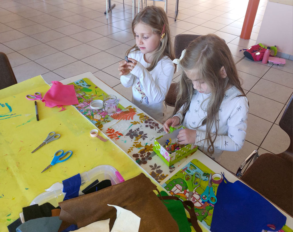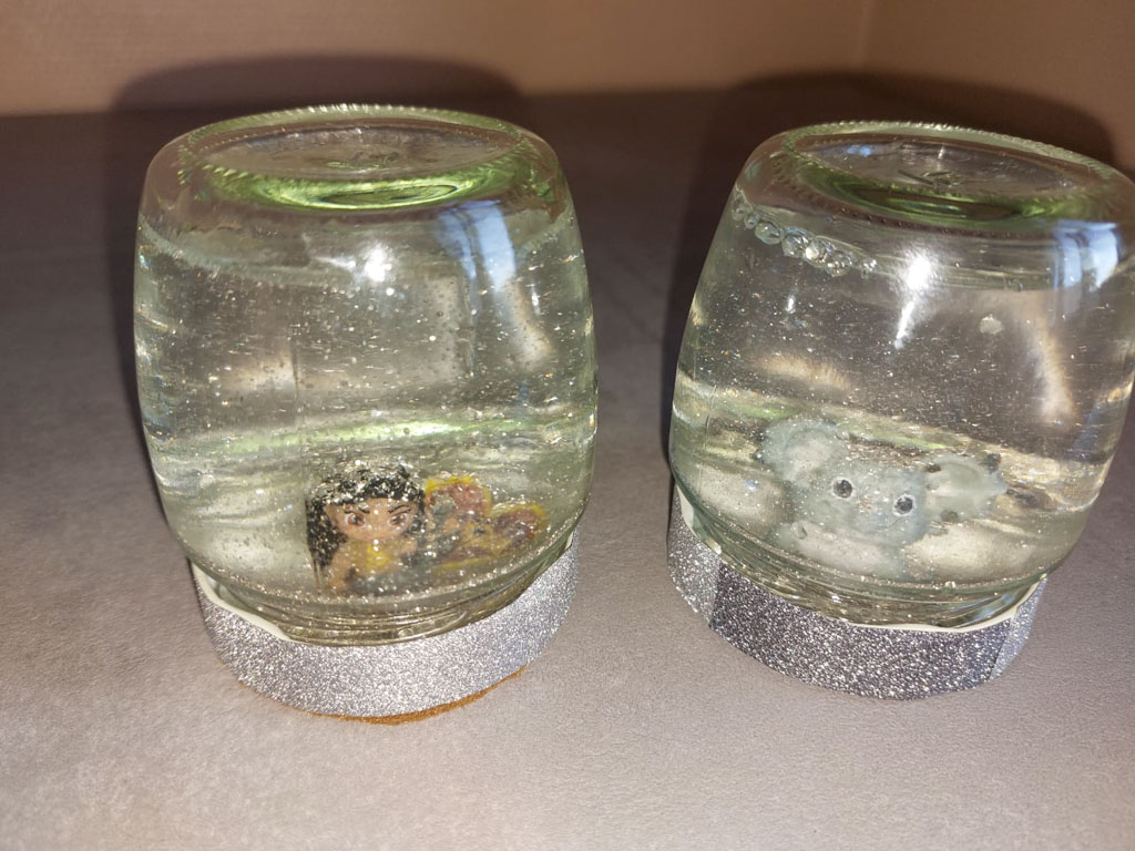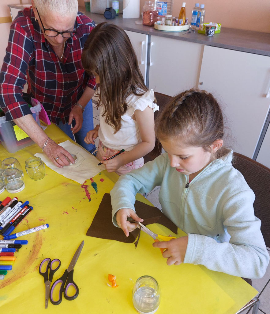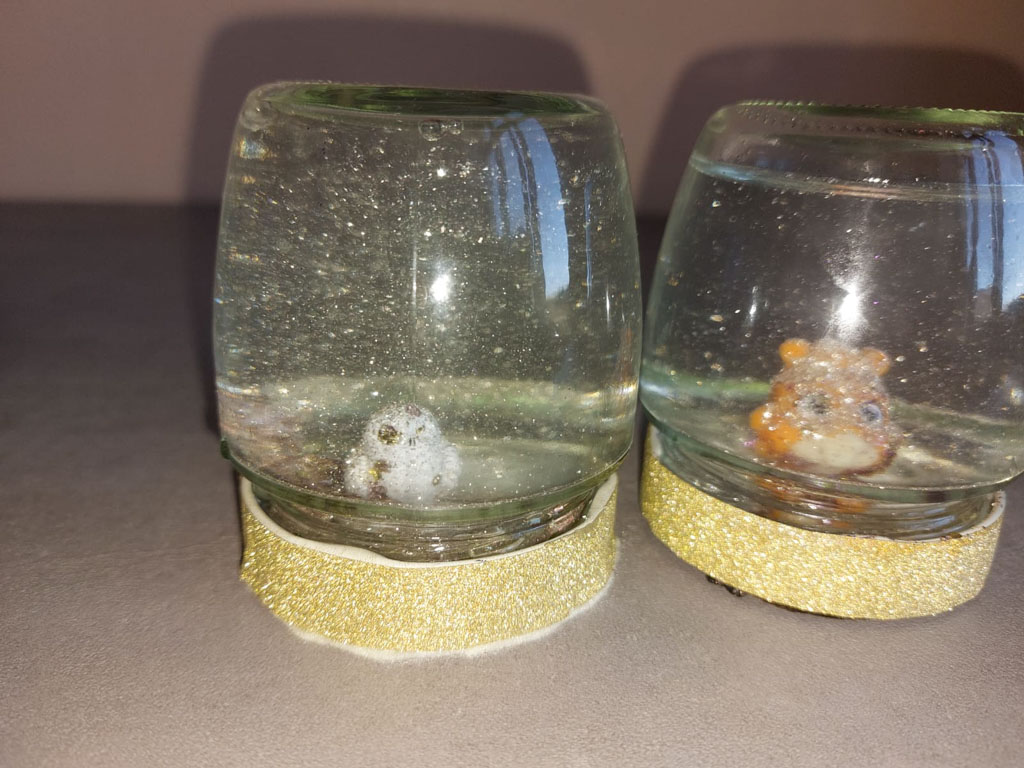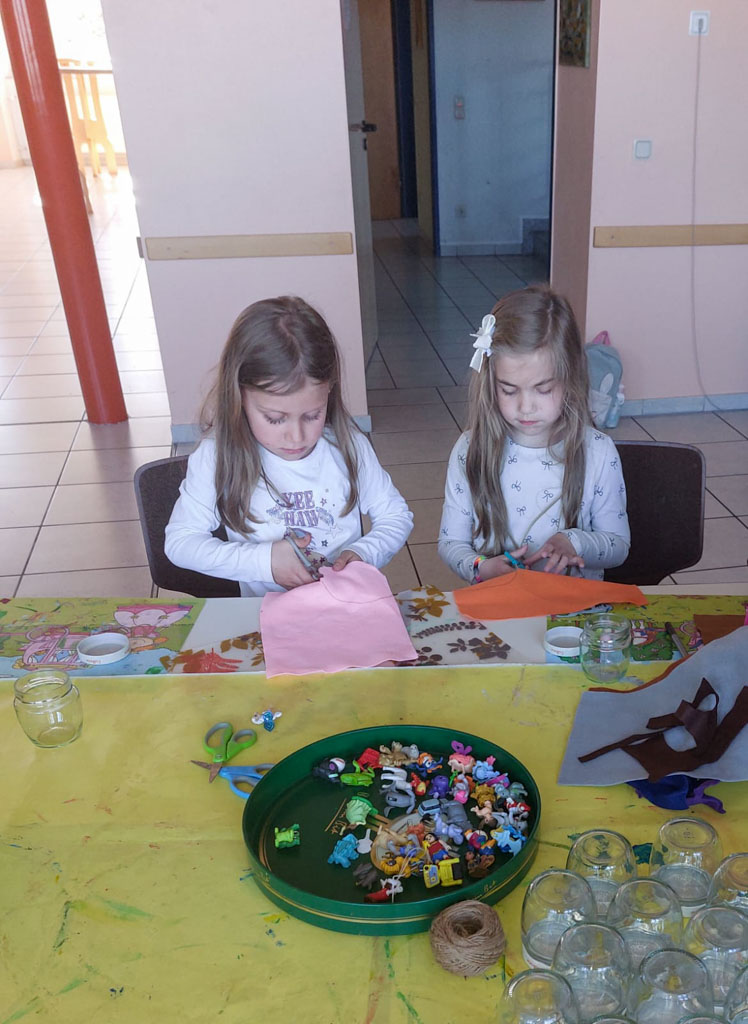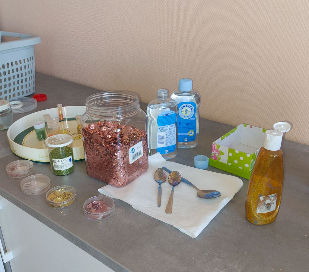 Der Apriltermin war spärlich besucht. Da aber wie immer jede Menge Material vorhanden war, konnten die Mädels sich richtig austoben bei den Bastelarbeiten. Marmeladengläser wurden mit destilliertem Wasser, etwas Babyöl und viel Glitzer gefüllt. Der Glasdeckel wurde vorher außen mit Band und/oder Filz bunt beklebt. Innen im Deckel wurde eine Ü‑Ei‑Figur festgeklebt. So entstanden viele tolle Glitzergläser.